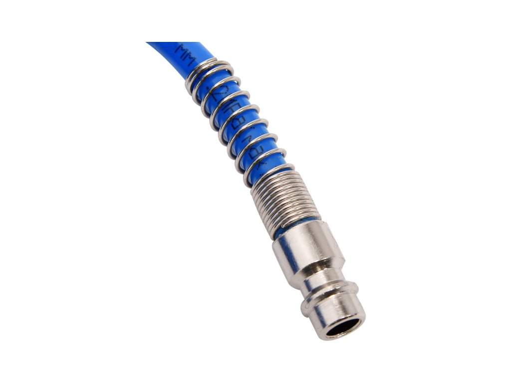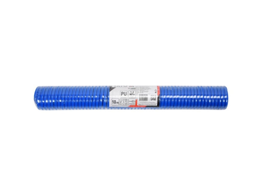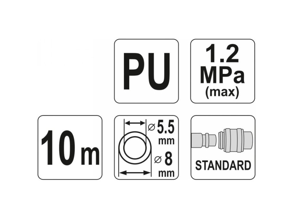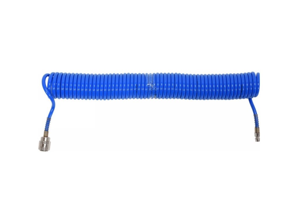 Professzionális spirális pneumatikus tömlő gyorscsatlakozókkal végződik. A tömlő 5,5x8 mm méretű, 10 méter hosszú és ellenálló poliuretánból készült. A tömlő ellenáll a alacsony és magas hőmérsékleteknek, így a műhelyen kívül is használható.