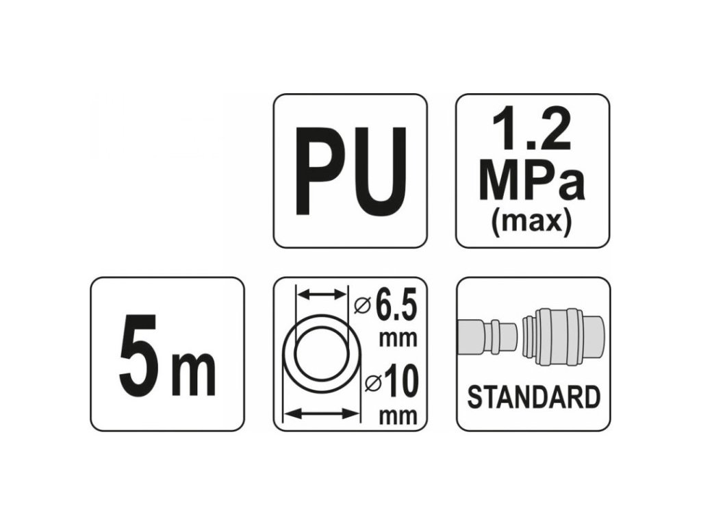 Professzionális spirális pneumatikus tömlő gyorscsatlakozókkal. Az ellenálló poliuretánból készült 6,5x10 mm-es, 5 méter hosszú tömlő alacsony és magas hőmérsékleteknek is ellenáll, így a műhelyen kívül is használható. A finom spirális kialakítás helyet takarít meg, a gyárilag telepített gyorscsatlakozók pedig nélkülözhetetlen eszközzé teszik bármely műhelyben vagy gyártósorban.