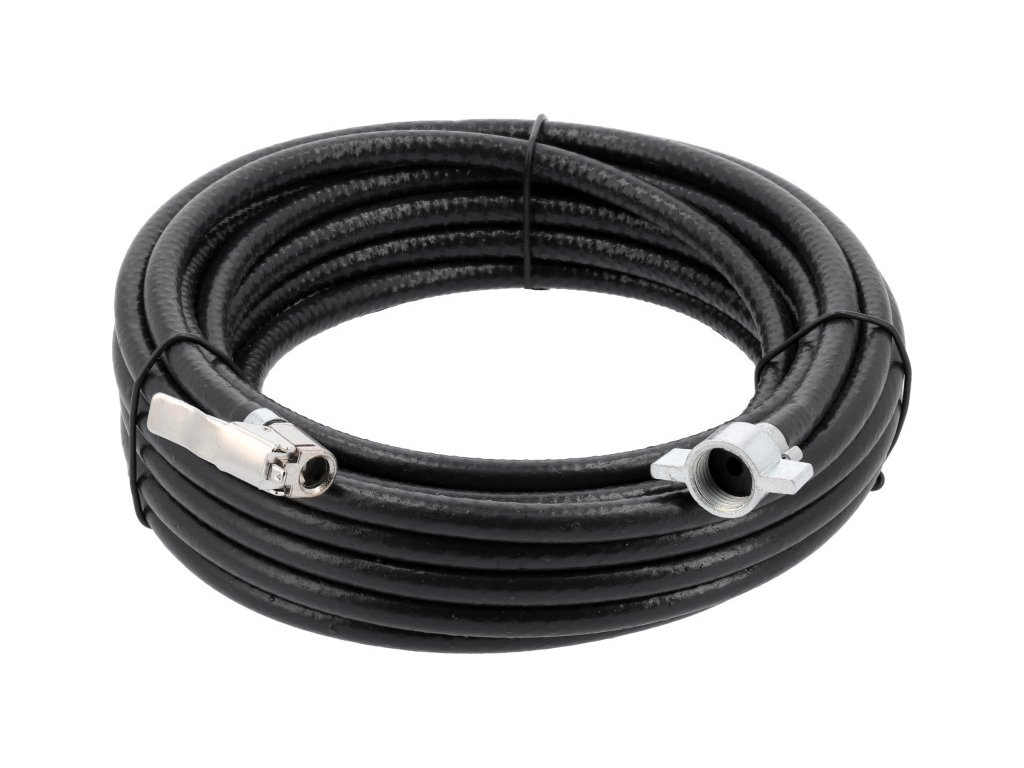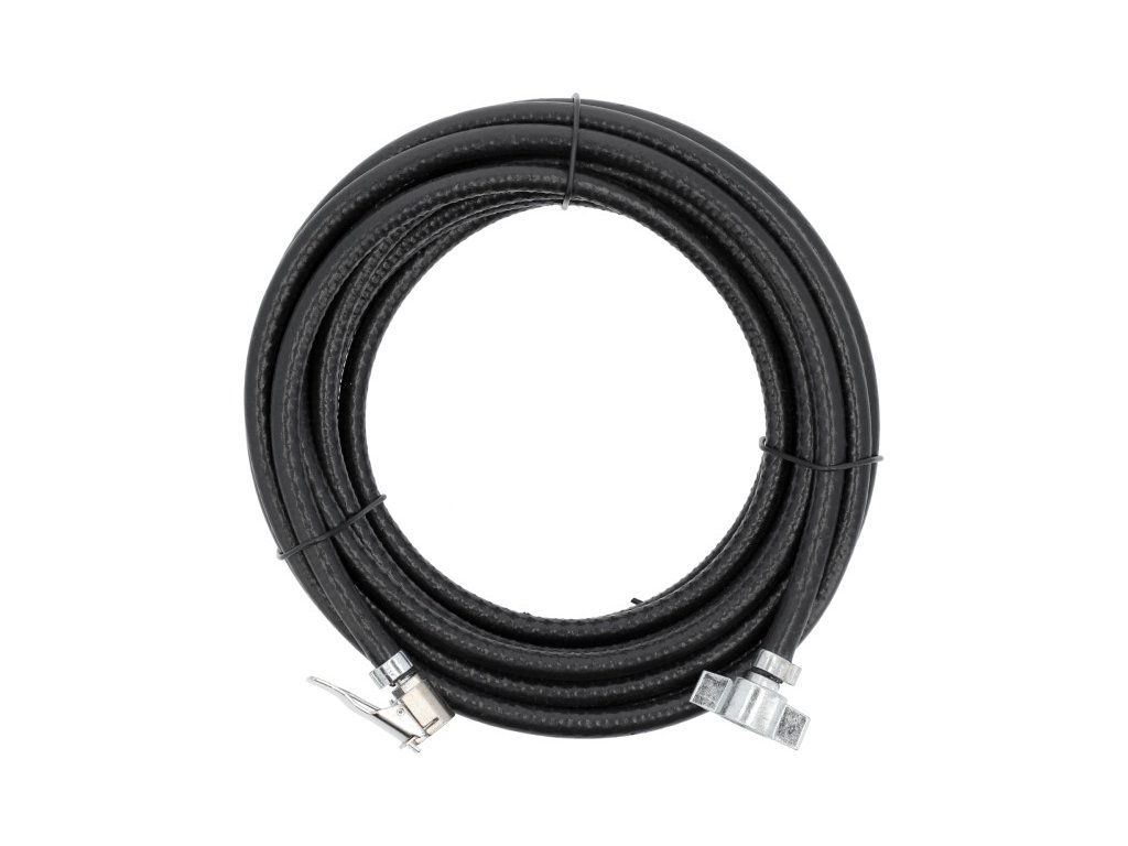 Professzionális, rugalmas sűrített levegős tömlő. Autókhoz alkalmazkodik légsűrítővel. Használt felfújáshoz kisteherautókban, teherautókban, pótkocsikban, mezőgazdasági traktorokban, stb. Lehetővé teszi, hogy akár egy nagyon hosszú jármű összes kerekét is fújja. Kábel mindkét oldalon csatlakozóval rendelkezik. Az egyik oldalon M16x1,5 mm-es női menetes pillangó végzéssel, amely autós kompresszorokhoz alkalmas. A második csatlakozó terminál hozzáigazítva standard autós szelephez. A tömlő három rétegből áll. A belső réteg puha PVC-ből és sűrű poliészter textil megerősítő fonatból készül. Időjárásálló PVC külső réteg.