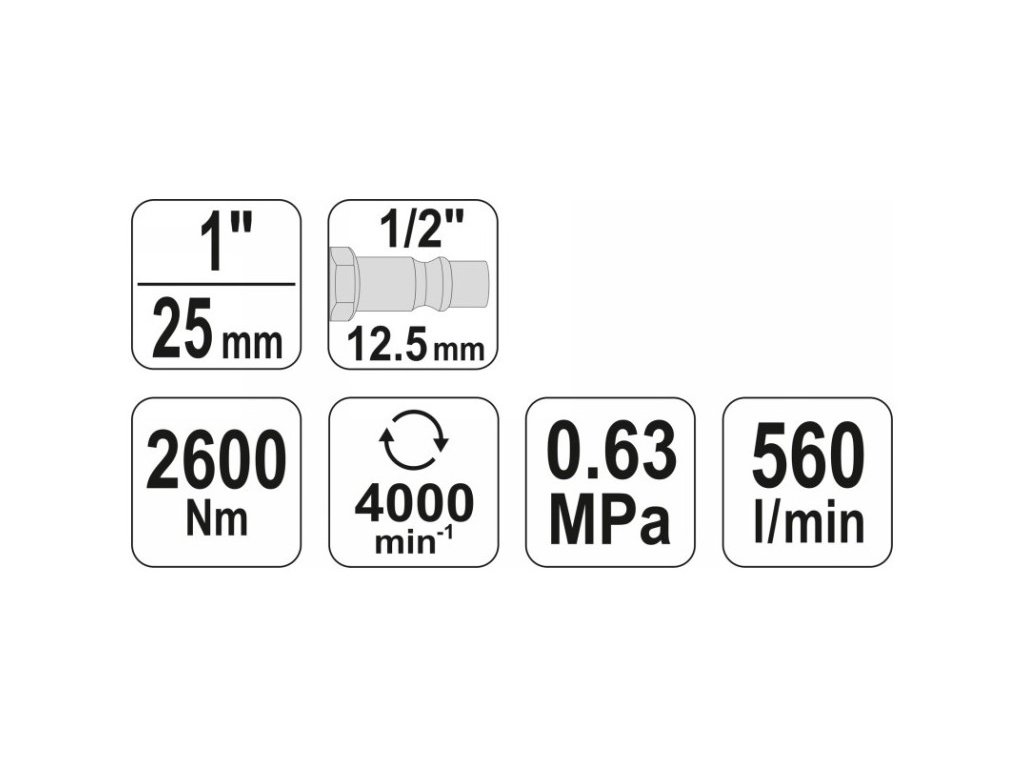 Technické údaje Prevádzkový tlak vzduchu 6,3 bar Krútiaci moment 2600 Nm Otáčky 4000/min Veľkosť pripojenia vzduchovej hadice 1/2 Spotreba vzduchu 560 l/min
