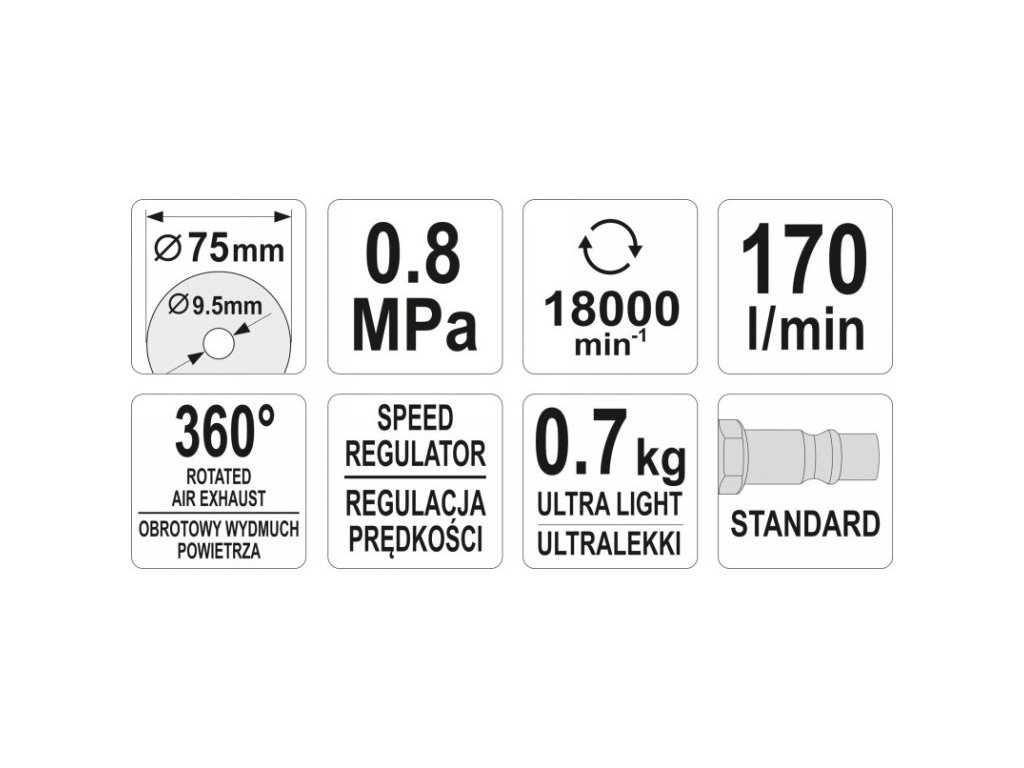 • Profesionálna pneumatická uhlová brúska na kov, diely karosérie, plechové konštrukcie a pod na rezanie • Určené pre prácu na pracovisku a v priemyselných podmienkach • Priemer kotúča: 75 mm • Tlak: 0,8 MPa • Prevádzkový tlak [MPa]: 0,63 • Produktivita [l/min]: 170 • Otáčky: 18 000 ot./min. • Regulácia otáčok • Ľahké, kompozitné puzdro a malé rozmery zaručujú pohodlnú prácu • Štandardné pripojenie