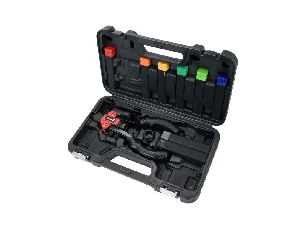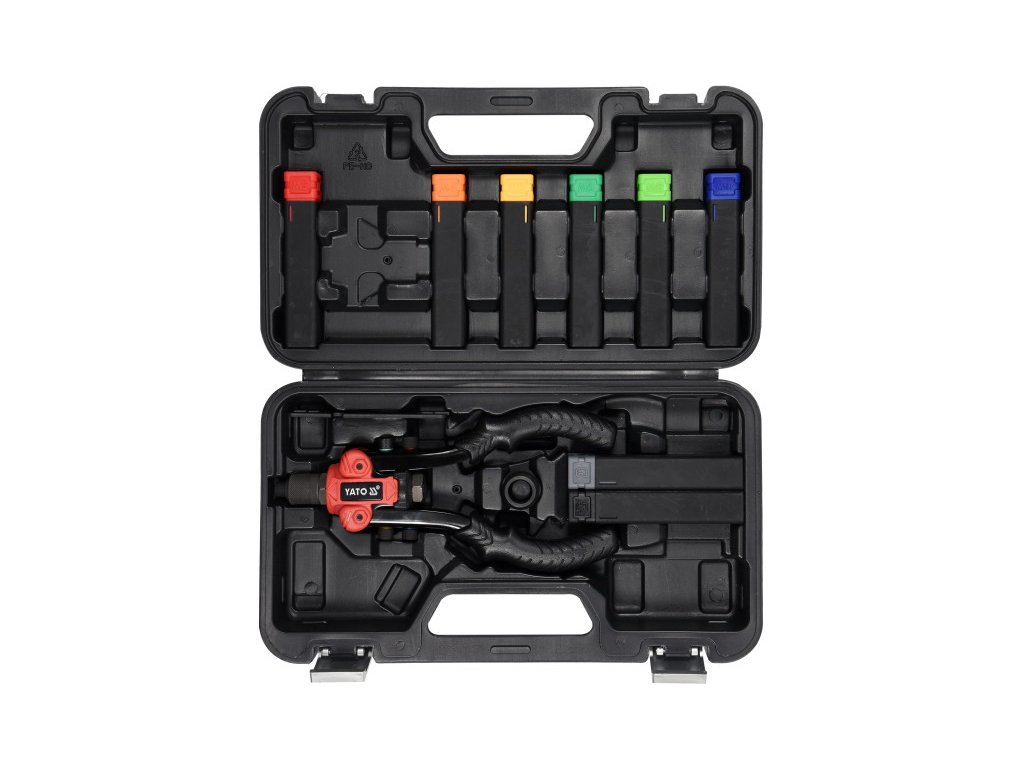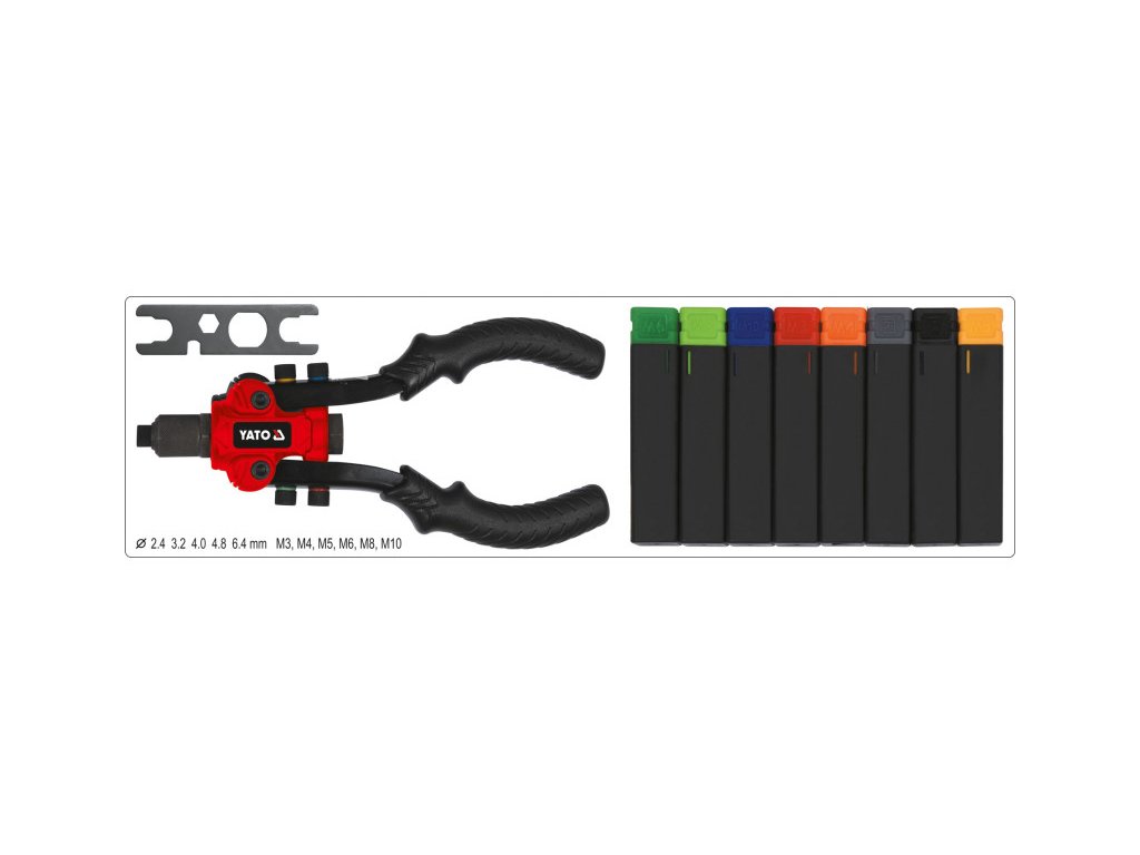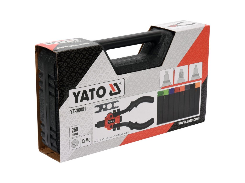 A YATO YT-36091 3-funkciós szegecselő gép a anyagok összekapcsolására lett tervezve szegecsanyák, szegecsek és vágás segítségével két vágófejjel (négyzet és kör alakú).