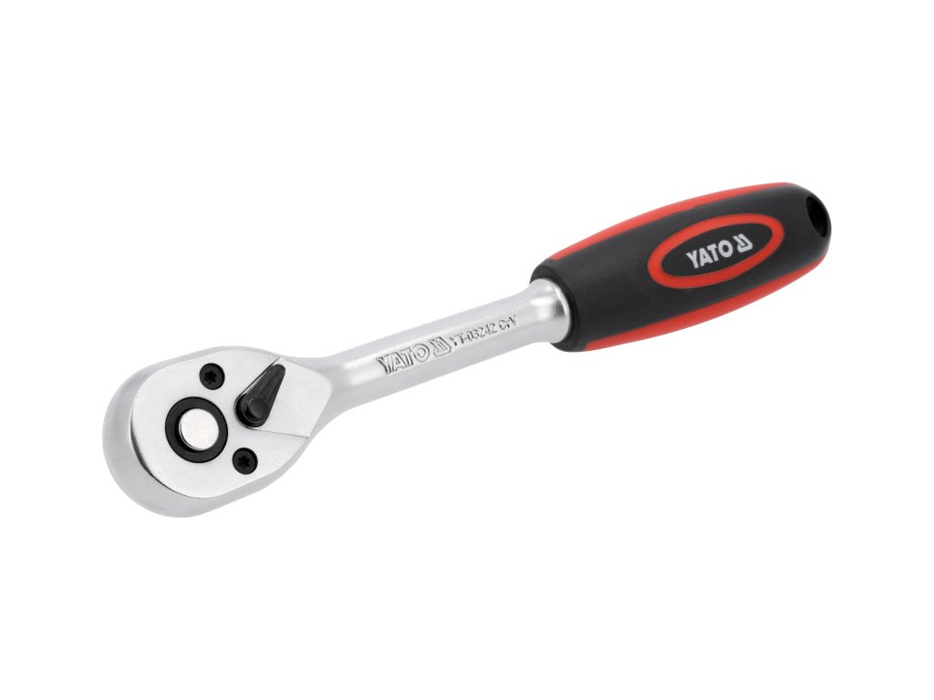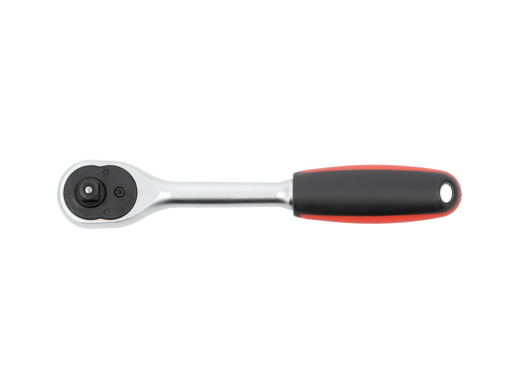 Egyenes racsnis kulcs 3/8'' dugókulcsokhoz, 210 mm hosszú. Gyorskioldó kapcsolóval és forgásirány kapcsolóval van ellátva.