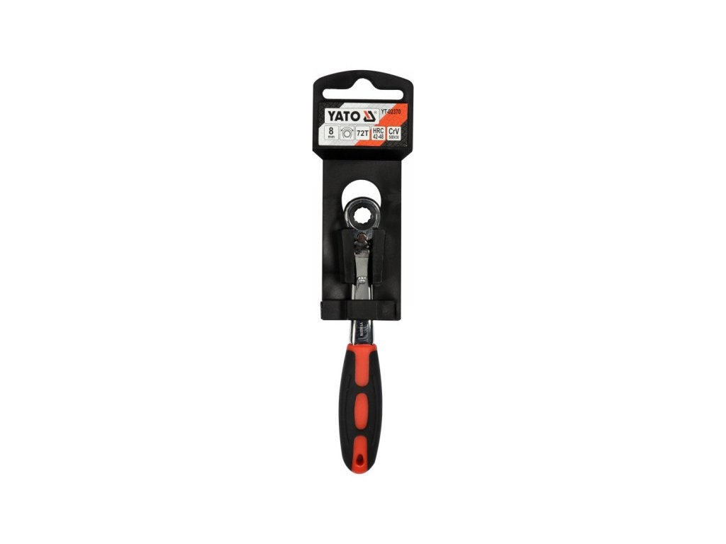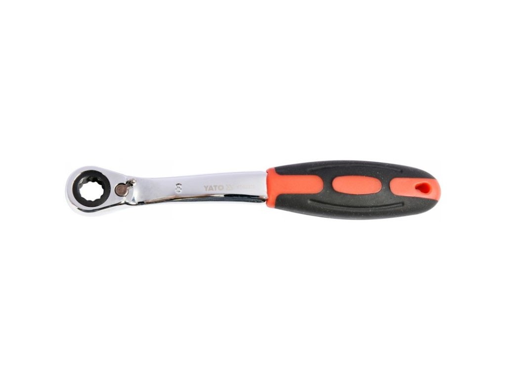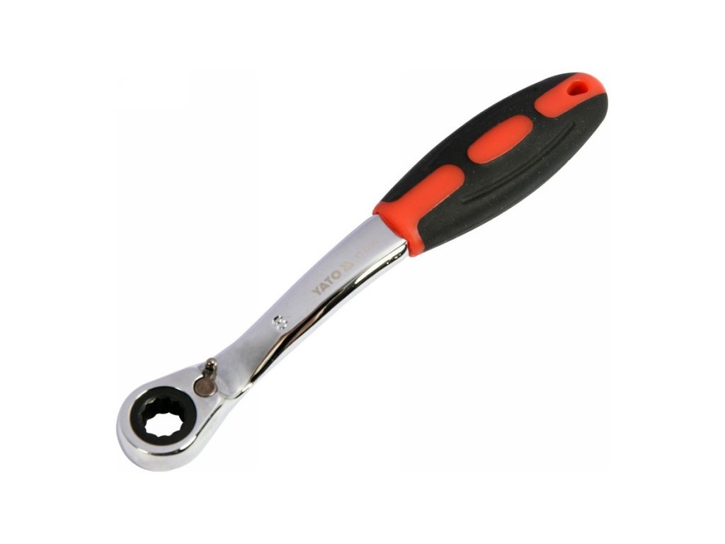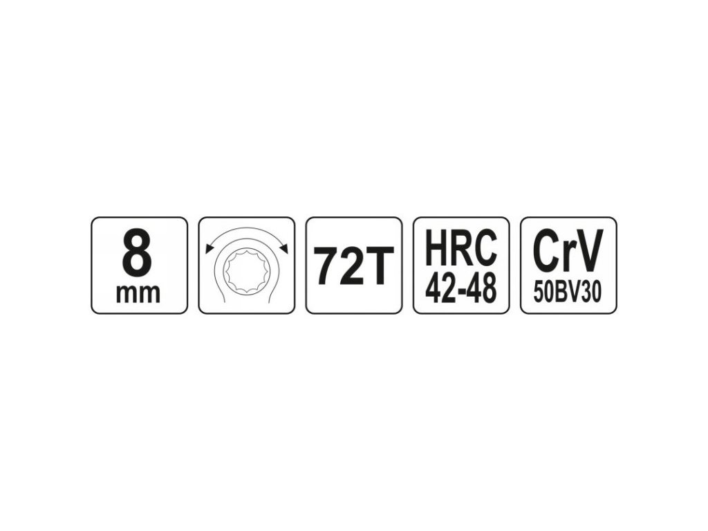 Račňový hviezdicový kľúč s ohnutým profilom, odporúčaný pre prácu v automobilovom priemysle Je vyrobený z odolnej CrV ocele s tvrdosťou 42-48 HRC, preto je odolný voči mechanickému poškodeniu, hlavica so 72 zubami, prepínač smeru otáčania, ergonomická, pogumovaná plastová rukoväť, ktorá zaisťuje stabilný úchop Technické údaje Dĺžka 140 mm Veľkosť skrutky 8 mm Počet zubov 72