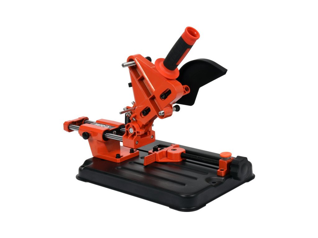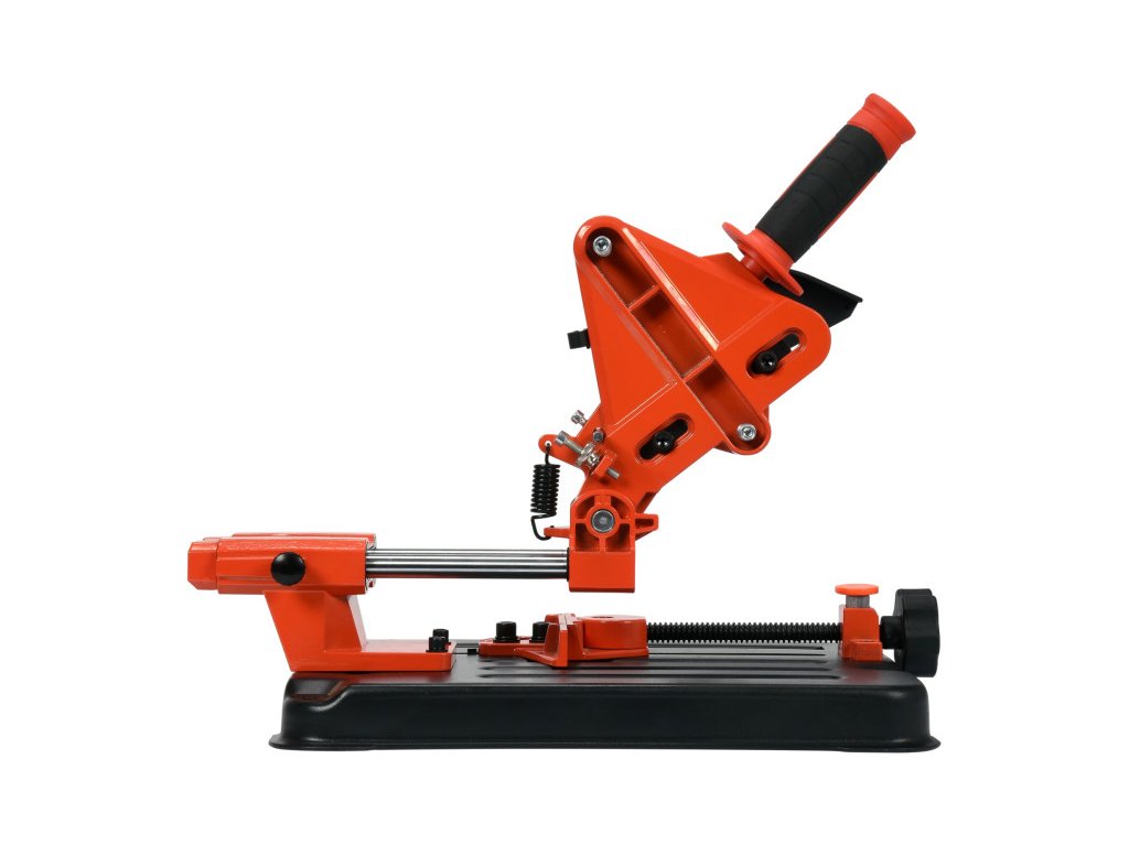 Stabil állvány, öntött acél alapon, 115 mm és 125 mm-es sarokcsiszolókhoz tervezve. Kiváló eszköz a biztonságos és precíz munkavégzéshez fém, fa, műanyag vagy kerámia alkatrészek vágásakor. Az állvány csapjainak szögbeállítása megfelelően kiválasztott keresztmetszetű elemekből készül, melyek állandóan rögzítik a vágandó anyagot.