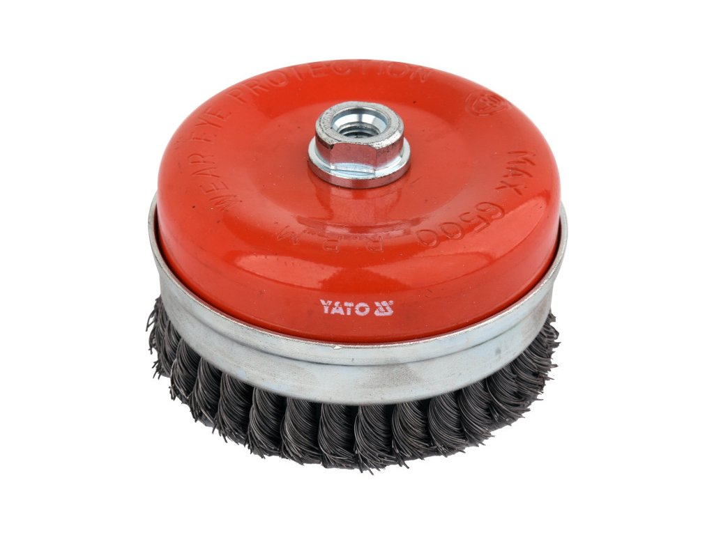 Egy markolókefe, amelyet fémfelületek tisztítására és polírozására, festékbevonatokhoz, valamint rozsda és szerszámok tisztítására terveztek, egy csiszológép segítségével.