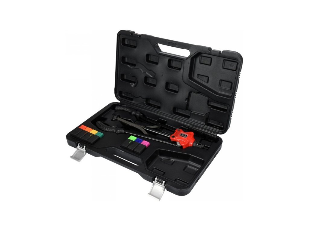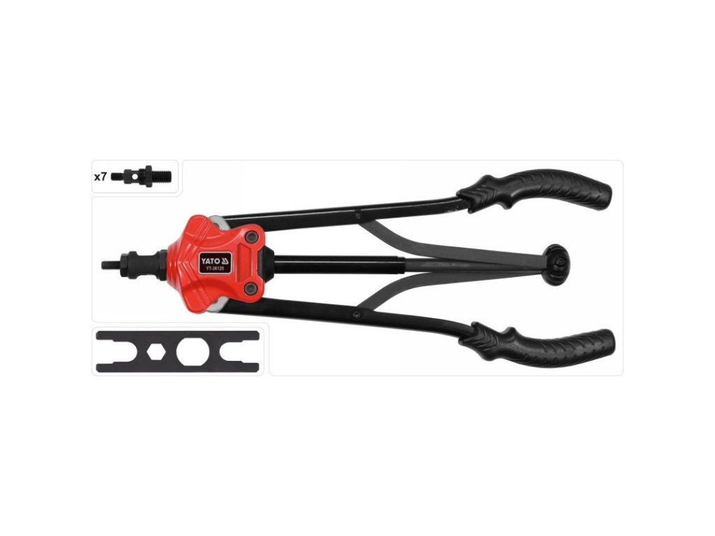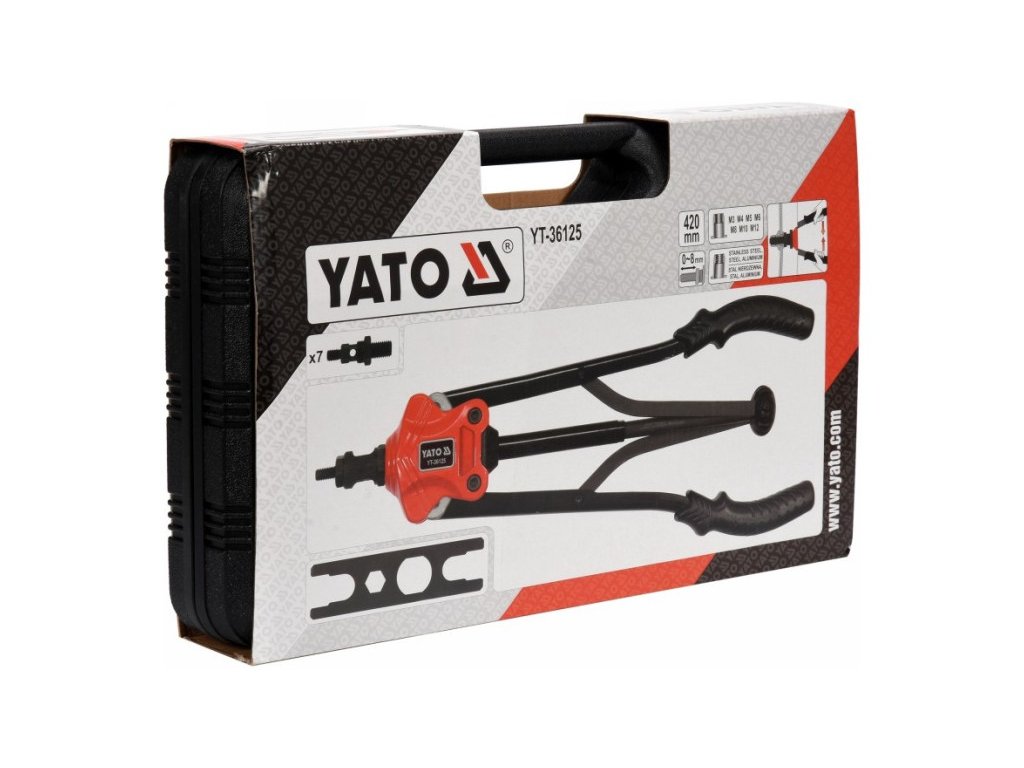 YATO YT-36125 M3-M12 kézi szegecsológép szegecsmutterekhez. A szegecsológép anyagok szegecsmutterekkel történő összekötésére szolgál. Belső menetes burkolatokkal köti össze az anyagokat. Lehetővé teszi további részek lemezcsavarokkal vagy csavarokkal történő csavarását. A fejek méretei: M3, M4, M5, M6, M8, M10, M12, tartós CRMO króm-molibdén szerszámacélból készültek. A fogantyúk csúszásgátló gumi borítással vannak ellátva. A gép teste alumíniumból készült. A szegecsológép rendelkezik gyorskioldó rendszerrel a szegecsmutterek munka befejezése utáni eltávolításához.