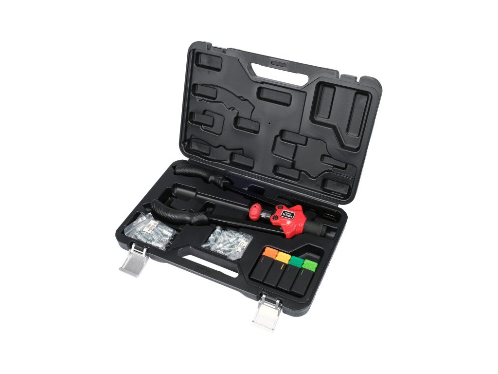 Tartós karos szegecselő gép M4, M5, M6, M8 méretű szegecscsapszeg behelyezésére. A szegecscsapszegek használata lehetővé teszi az anyagok összekötését sima és szárnyas anyákkal.