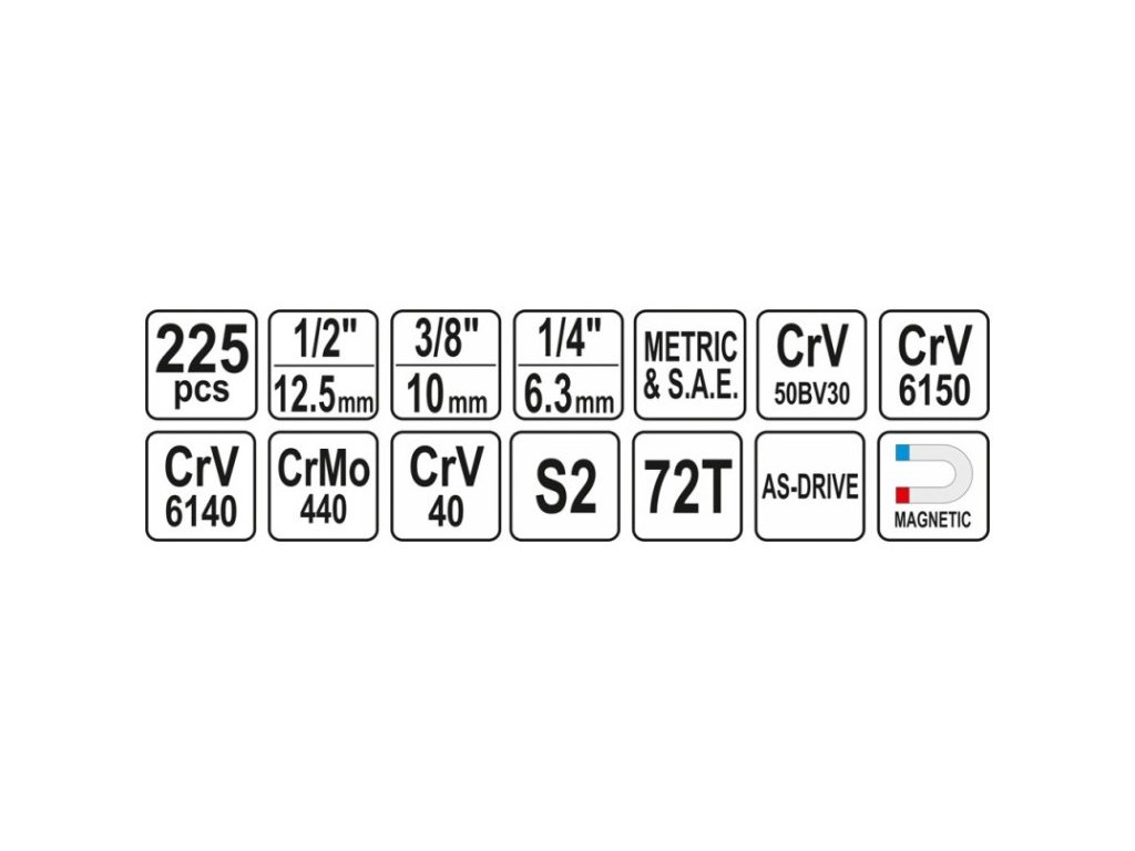 Gola sada 1/4”, 3/8”, 1/2” + príslušenstvo 225ks