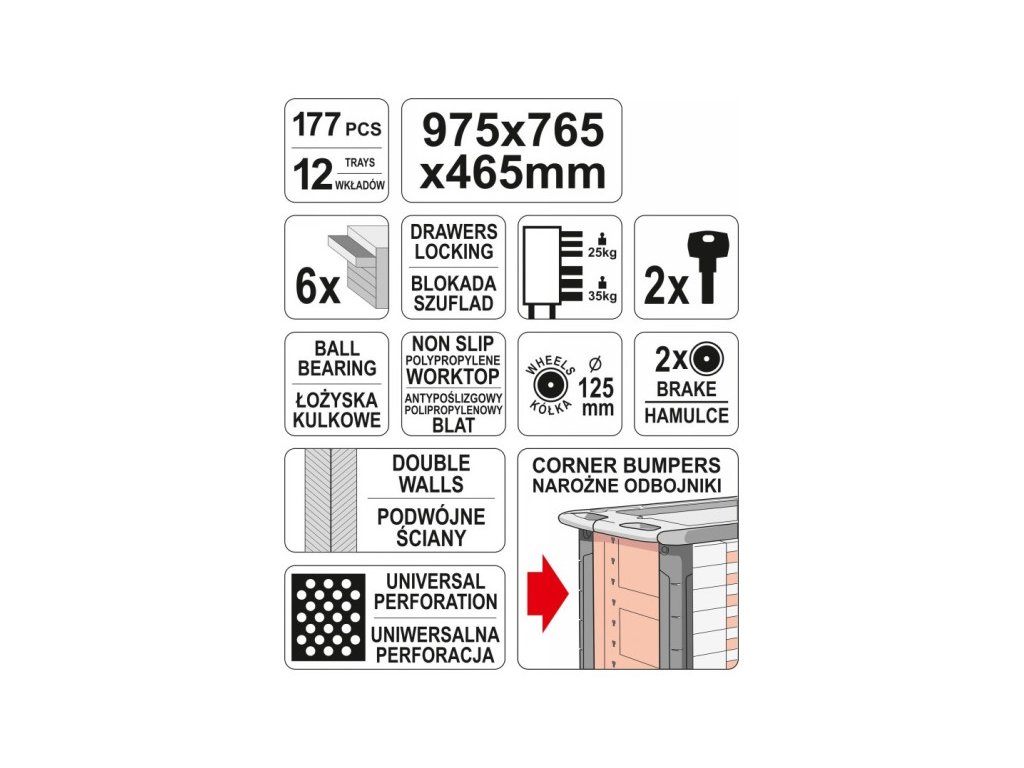 A profilok kétszeres lemezből készültek. A műhelyszekrény sarkain védőbordák találhatók, amelyek megvédik a véletlen sérülésektől, mint például az autó karosszériájának ütődése. Erősségei közé tartozik a csúszásmentes munkafelület, a 125 mm-es gumi kerekek, ebből 2 fékkel, univerzális falperforálás, dupla falak.