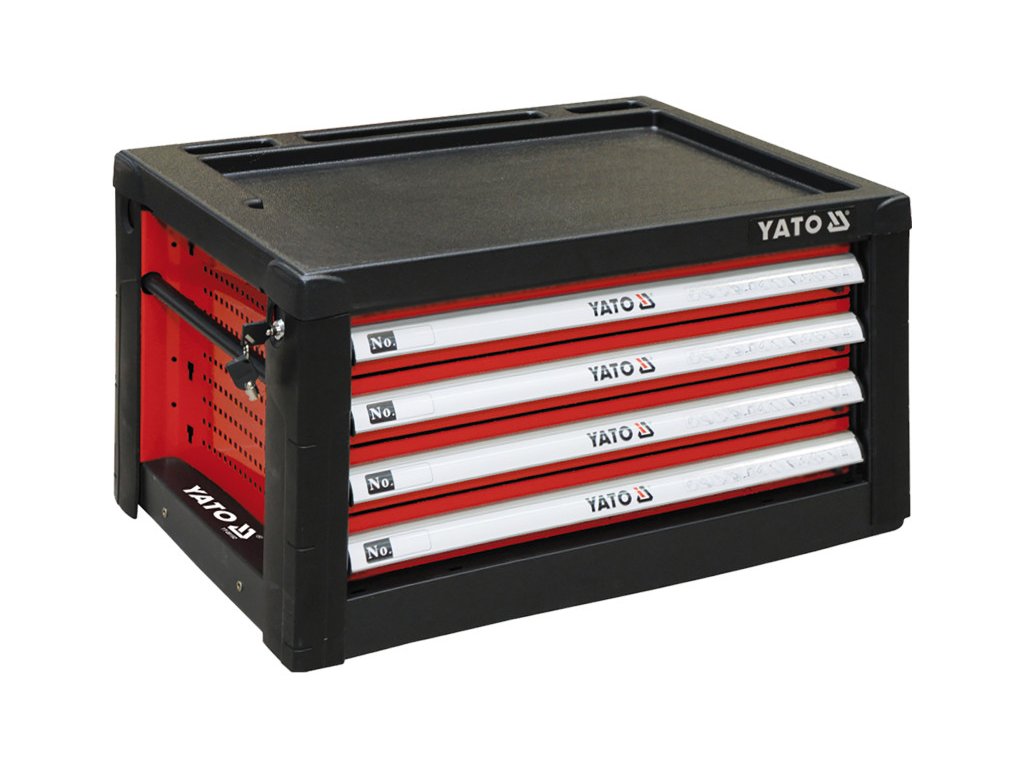 Professzionális műhelyszekrény, mely 4 központilag zárható fiókkal van felszerelve. A fiókok golyóscsapágyas sínekkel működnek, melyek egy nagy teherbírású többgolyós mechanizmuson alapulnak. A műhelyszekrény munkafelülete ABS műanyagból készült. A szekrény élei ütésálló anyaggal vannak védve. A porfestett szekrény a legmagasabb minőségű kivitelezést képviseli. A műhelyszekrény teljes mérete: 690 mm x 465 mm x 400 mm. A fiókok belső mérete: 533 mm x 397 mm x 55 mm.