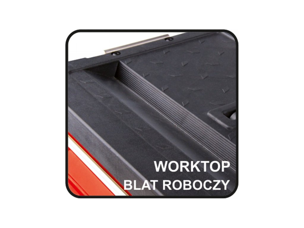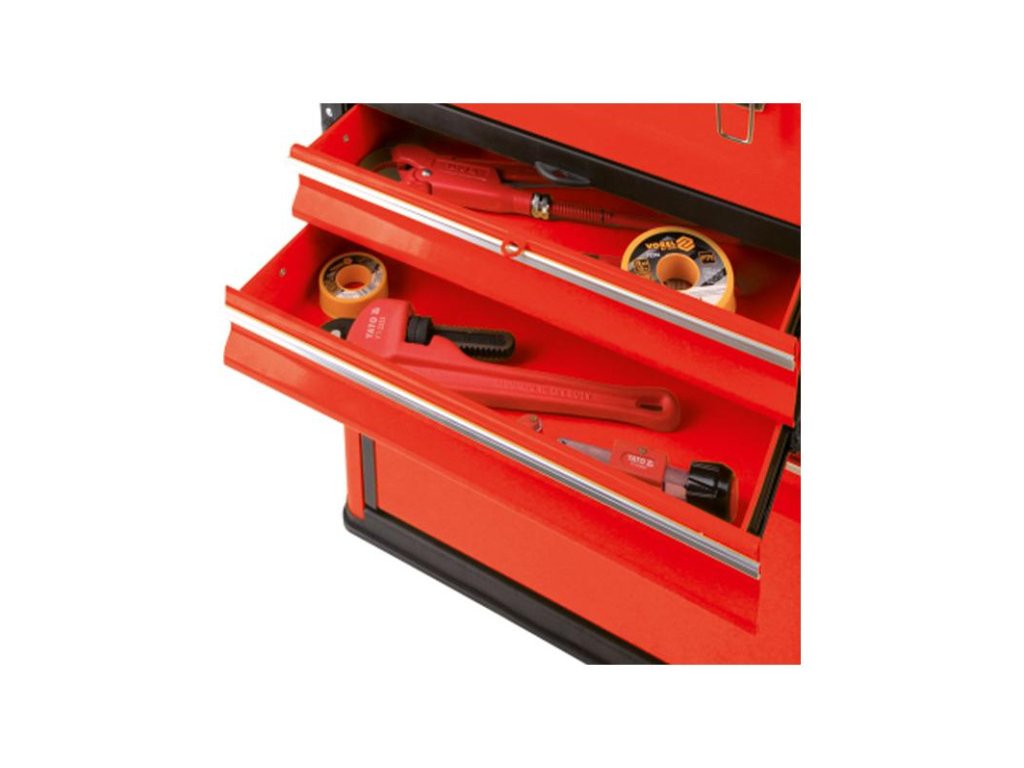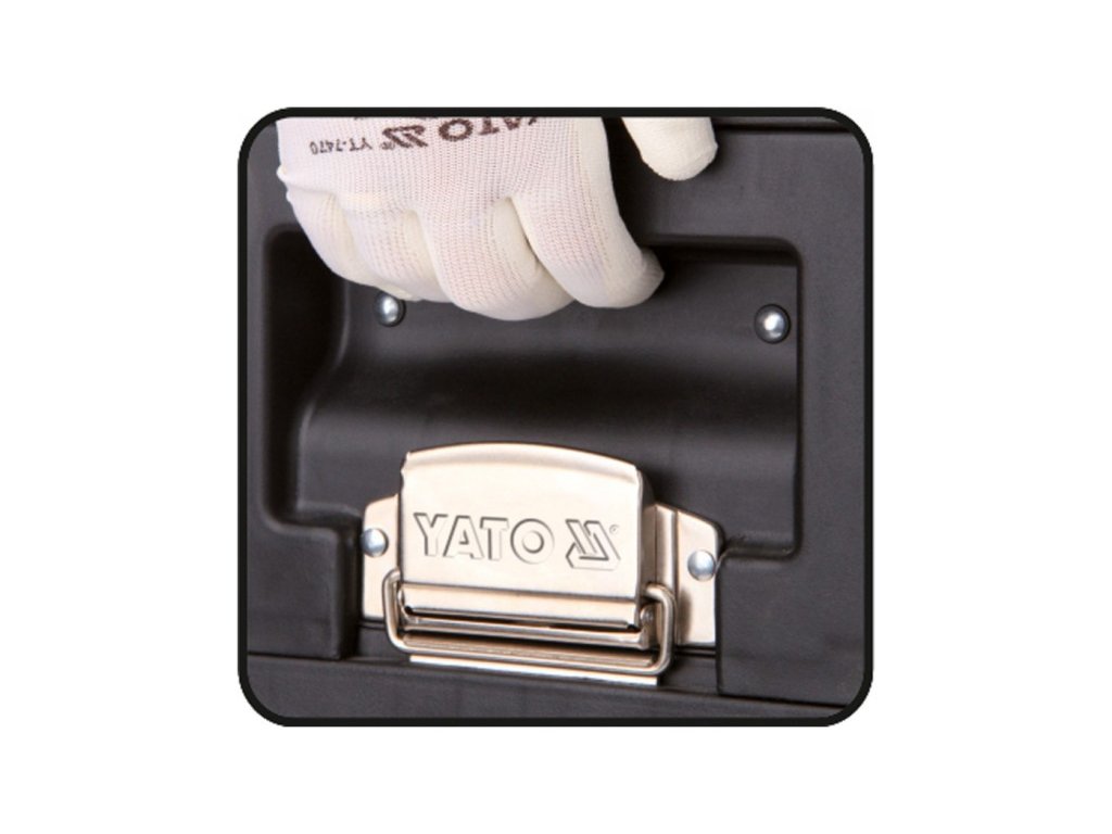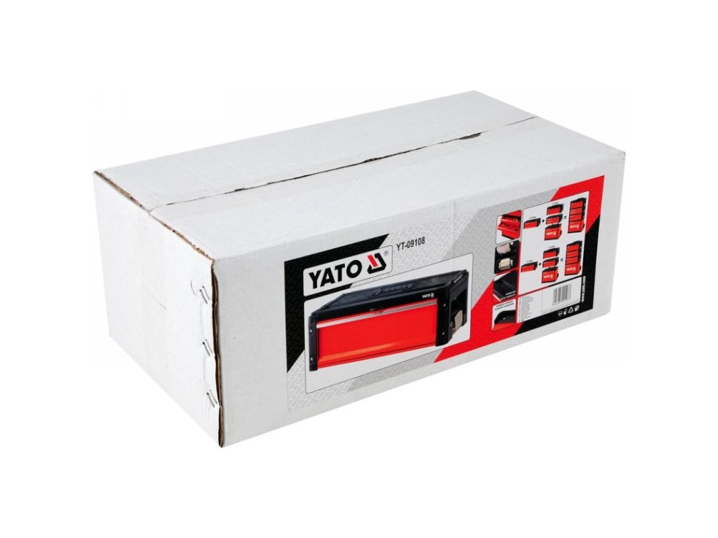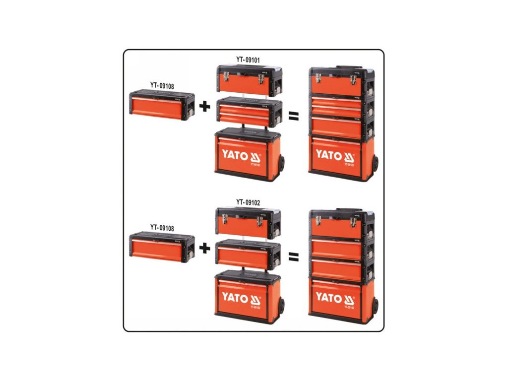 Moduláris doboz 1 fiókkal. Rendelkezik 1 fémből készült fiókkal, amelynek teherbírása 10 kg és mérete 390x215x130 mm. A fiók fém sínen található golyóscsapágyakkal van felszerelve. A modulnak lapos teteje van, amely munkalapként is használható. Ezenkívül rendelkezik egy barázdával, amely nagyon hasznos fúráskor vagy csavarok becsavarásakor. Továbbá a modulnak kényelmes, csúszásmentes fogantyúja, oldalsó fogantyúi vannak a könnyű emelés érdekében, és csúszásmentes alsó sarkai. A fiókba Yato szerszámtálcákat helyezhet el kész szerszámkészletekkel. Lehetőség van a doboz önálló használatára, valamint mint további modul használata a YT-09101 vagy YT-09102 szekrényben.