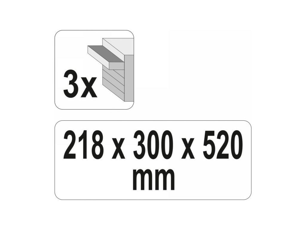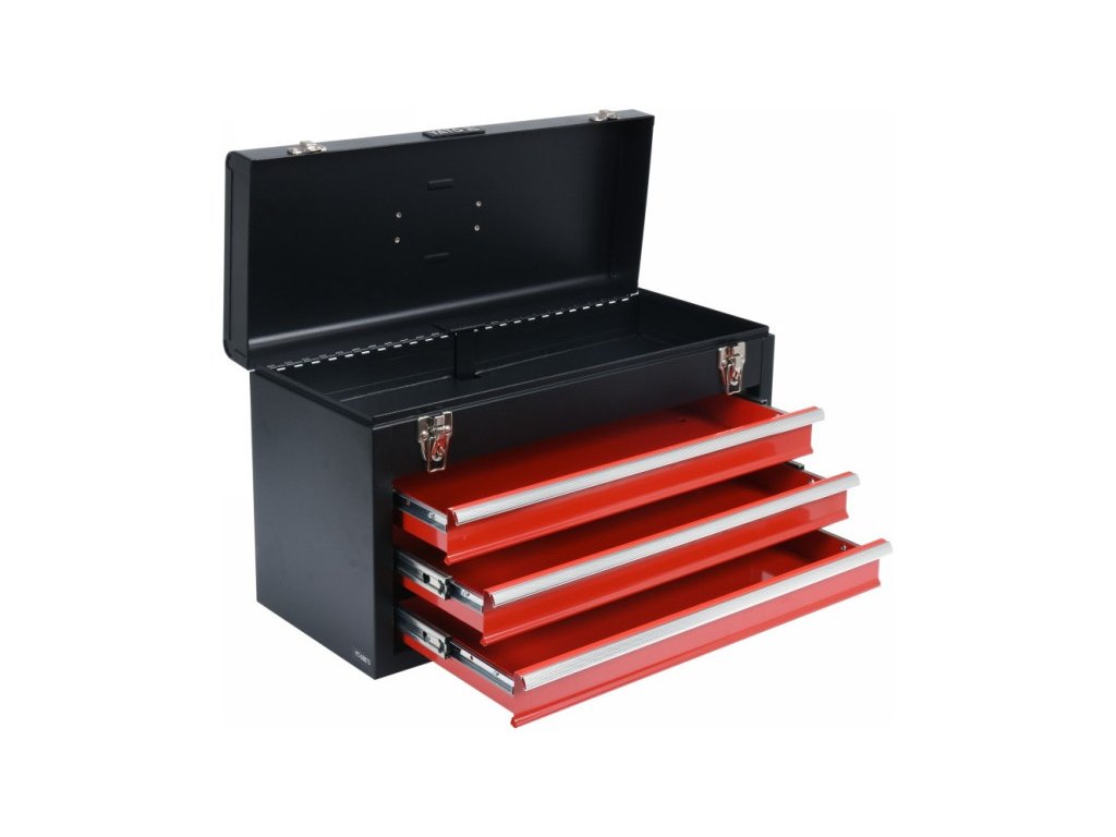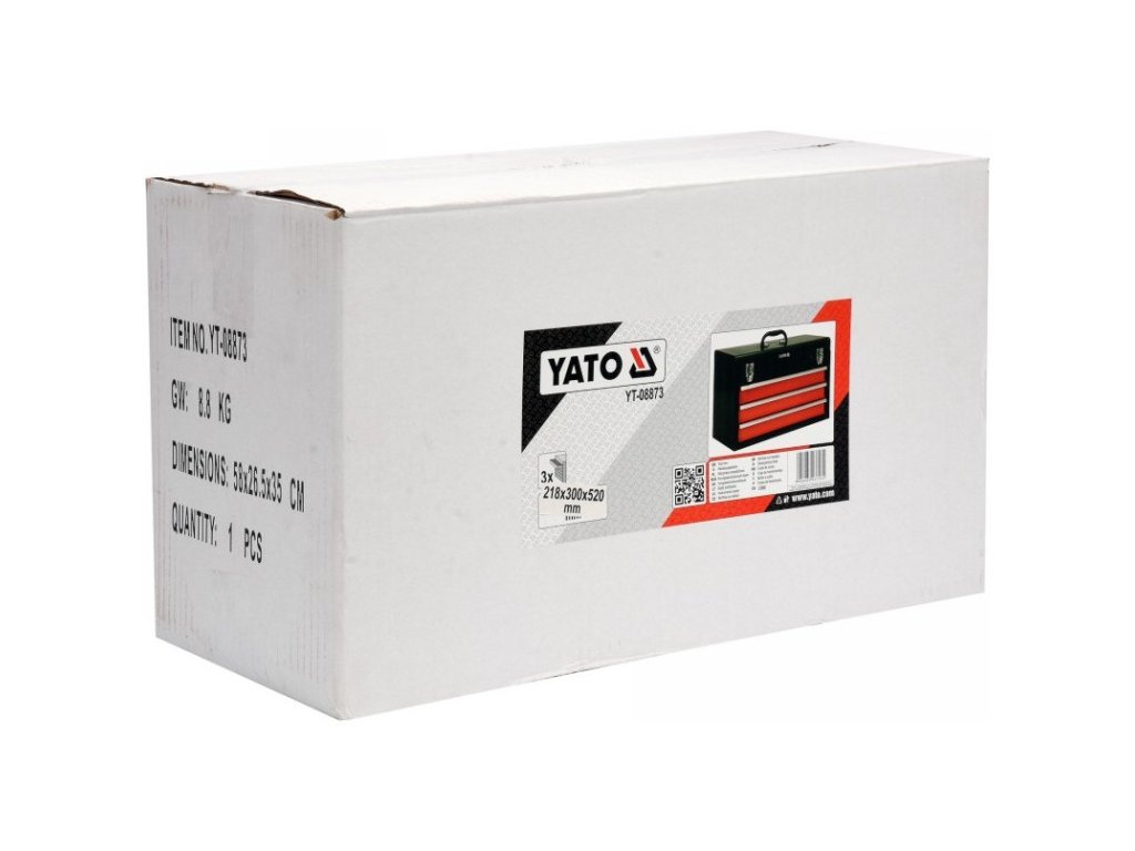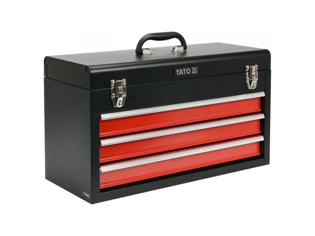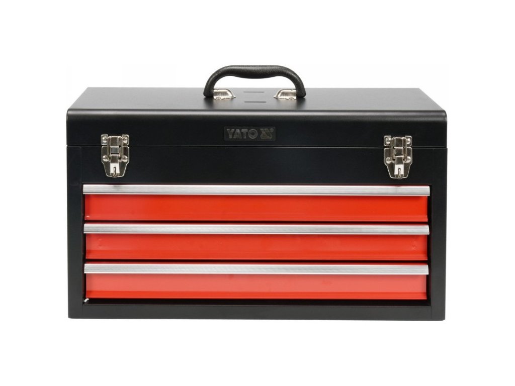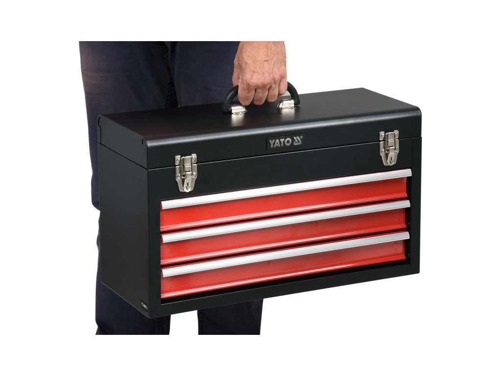 YATO műhelyeszközök tárolására szolgáló szerszámosláda, melyben fiókok találhatóak, amelyek fémgörgős kisiklásgátlókon futnak. Rendelkeznek továbbá további tárolórésszel a tetején, melyet fémkapcsokkal lehet lezárni.