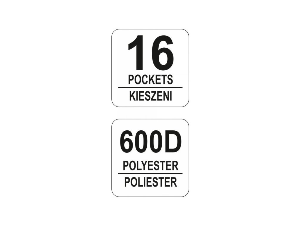 Válltáska pánttal és extra hordozófogantyúval, mely technikai 600 D poliészterből készült. 16 különböző zsebbel és csúszásgátló műanyag lábakkal rendelkezik.