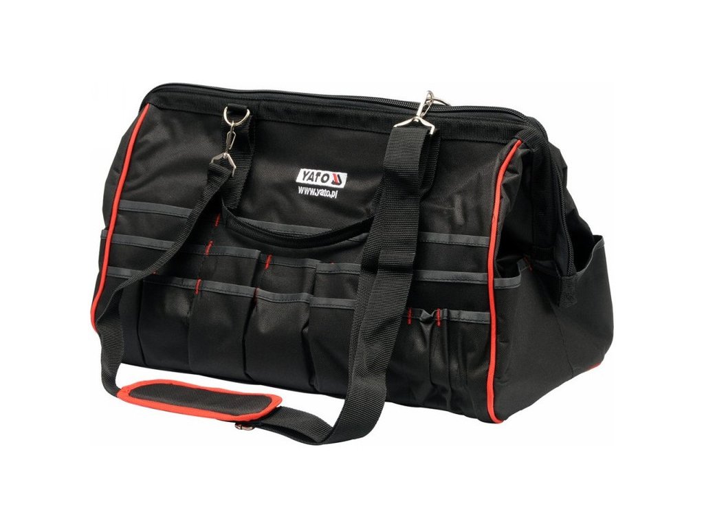 Praktikus YATO márkájú szerszámtáska, erősített nylonból készült, fémcsattal megerősítve, könnyű nyitás és zárás érdekében. A praktikus és könnyen működő cipzár, valamint a számos zseb és rekesz a táska ideális mobil szervizműhelyhez, otthonhoz, kertbe.