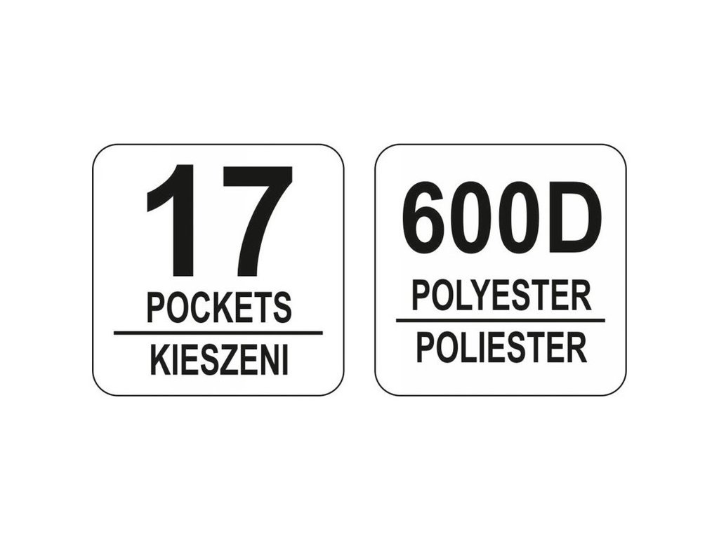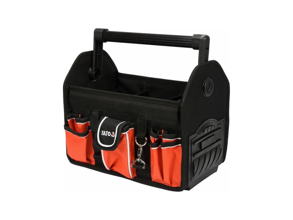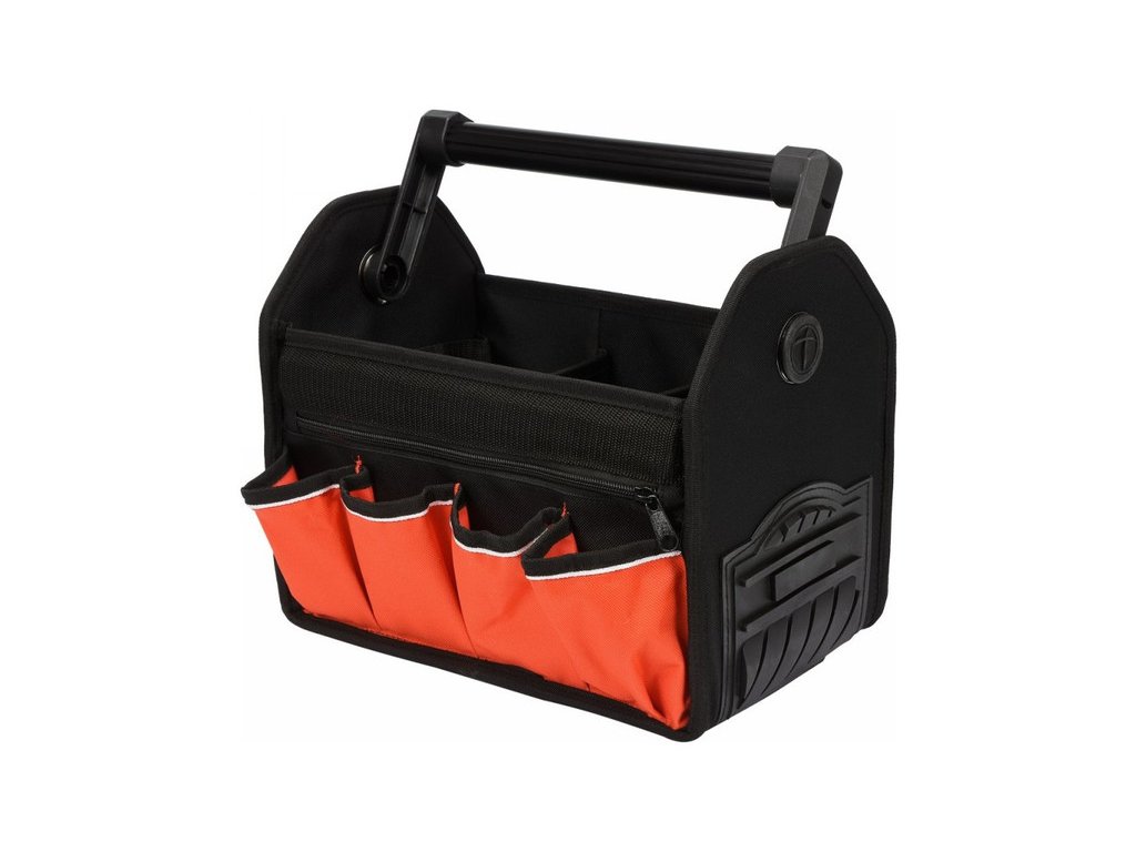 Nagy, nyitott szerszámtároló, mely technikai 600 D poliészterből készült. A tároló alja megerősített, nedvességálló kivitelben. Ezért használható olyan helyeken is, ahol kevésbé kellemes munkakörülmények uralkodnak. A fejvarratok és zsebek nagy teherbírású változatban. A központi fogantyú, mely alumínium csőből készült és lágy, csúszásgátló borítással rendelkezik, nagy terhelést bír el és stabilizálja a tároló formáját.