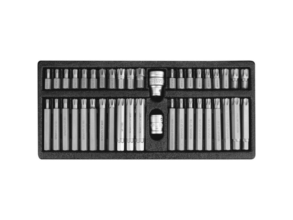 • Torx: T20, T25, T30, T40, T45, T50, T55, T60, T70/L=30 mm AISI S2 • Torx: T20, T25, T30, T40, T45, T50, T55, T60, T70/L= 75 mm AISI S2 • RIBE: M4, M5, M6, M7, M8, M9, M10, M11, M12, M13, M14/L=30 mm AISI S2 • RIBE: M4, M5, M6, M7, M8, M9, M10, M11, M12, M13, M14/L=75 mm AISI S2 • Adaptér: 1/2”: 10 mm, 3/8”: 10 mm, CrV 6150