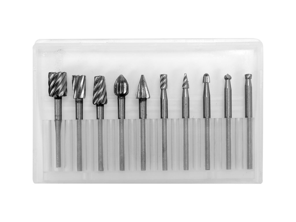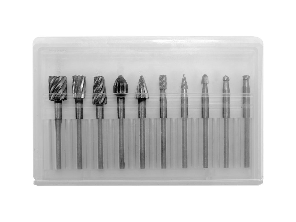 - készlet tartalma: gömbmaró Ø 2x40 mm / kúpos maró x3 (Ø 4x40 mm, Ø 6x40 mm, Ø 10x40 mm)/ ferde maró Ø 12x40 mm / fordított kúpos maró Ø 2x40 mm / lángmaró Ø 9x40 mm / hengeres maró x3 (Ø 6x40 mm, Ø 10x40 mm, Ø 10x40 mm)