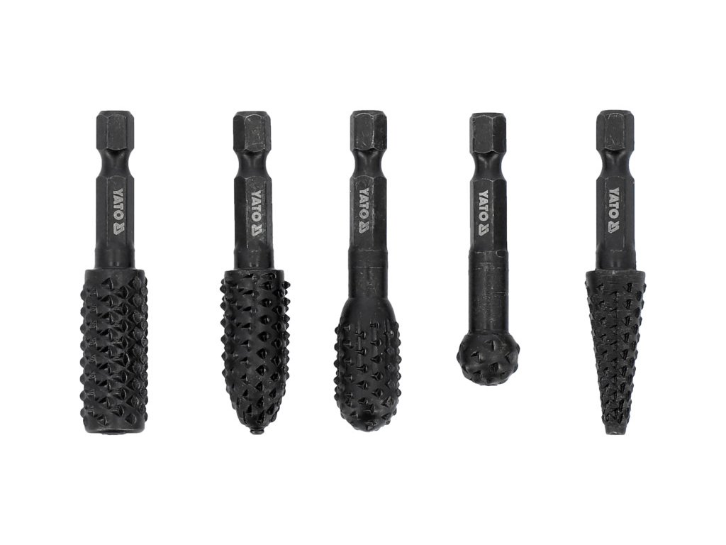 Feketés szénacélból készült forgó reszelő készlet. Faipari munkáknál, ajtózárszerelésnél lyukak bővítésénél, asztalos illesztésekhez és élek lekerekítéséhez használják.