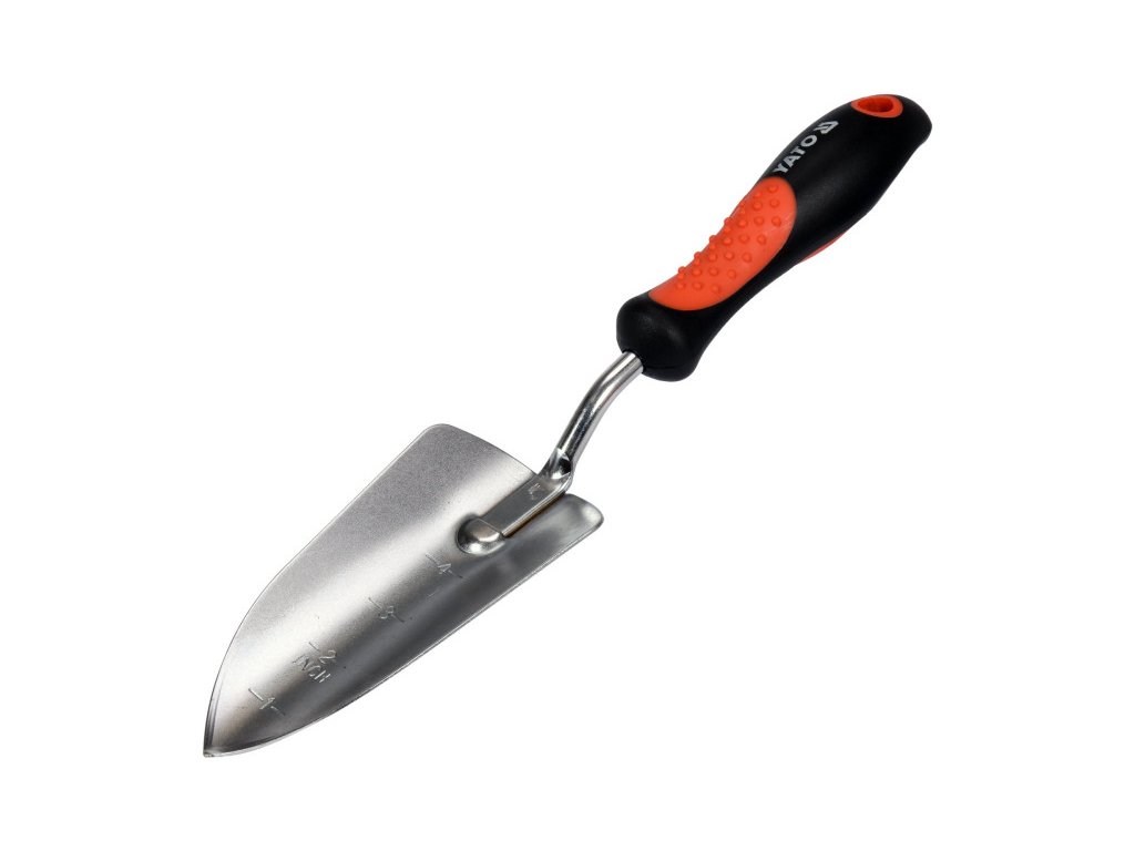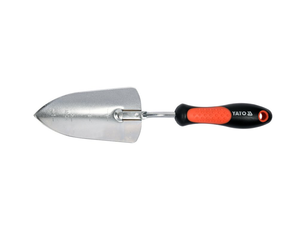 Acél lapát, melynek munkarésze 70 mm széles. Rövid nyélre szerelve, kényelmes műanyag fogantyúval. Takarítási és kerti munkákhoz tervezték, beleértve a növények ültetését és átültetését. A munkarészen praktikus mérőszalag található.