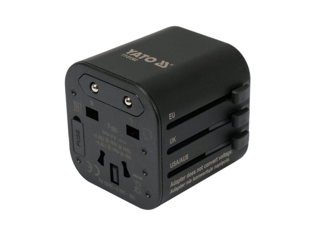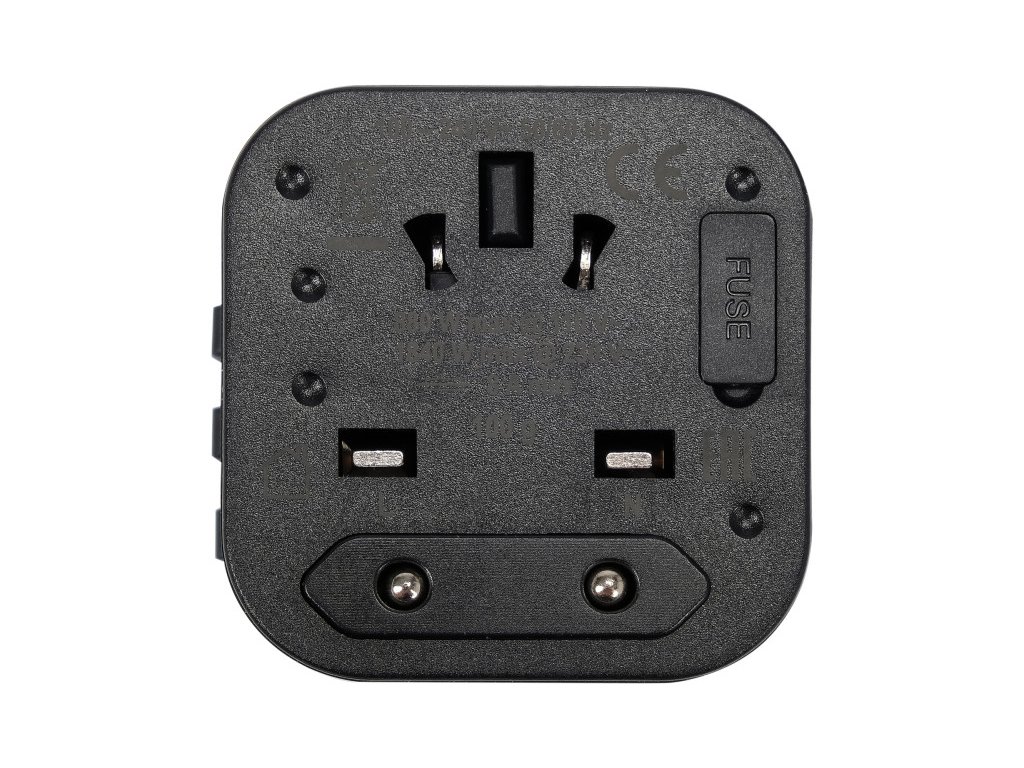 Levehető dugaszok zárral, ami megakadályozza a tüskék visszacsúszását a házba. Az adapter rövidzárlat ellen védve egy könnyen hozzáférhető kerámia biztosítékkal. A ház tűzálló műanyagból készült.