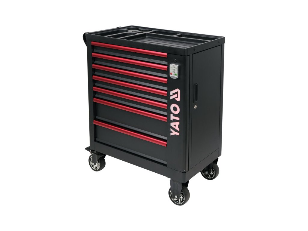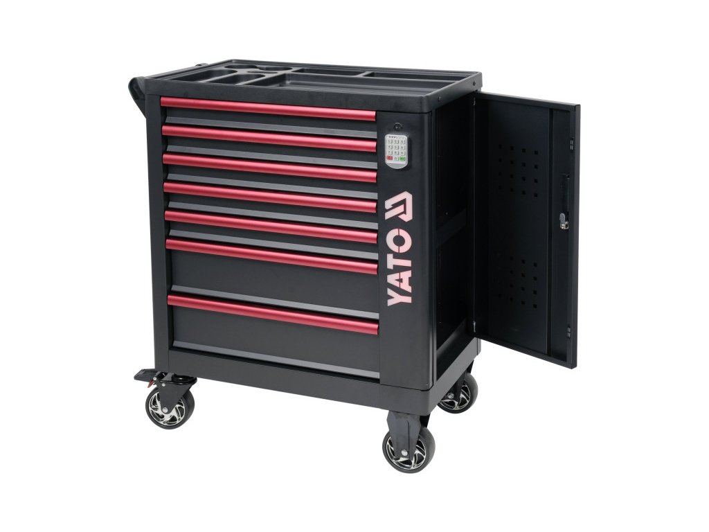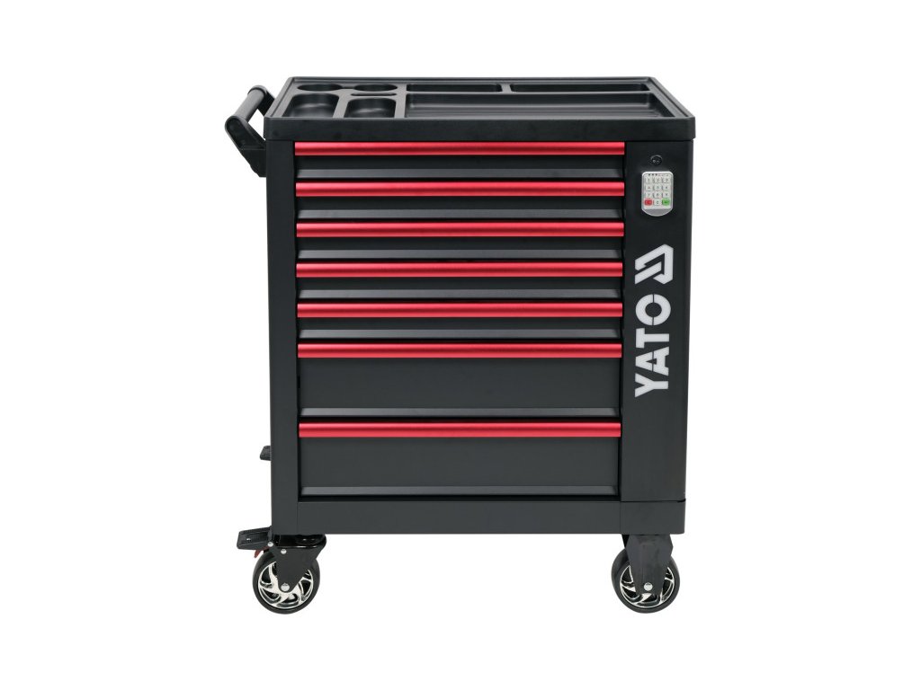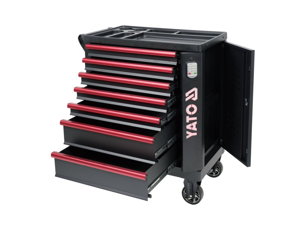 Perfektné vybavenie pre profesionálnych operátorov a tých, ktorí hľadajú renomované náradie do garáže Vozík na náradie má digitálny zámok a osvetlené logo Všetky vložky do nástrojov YATO sú s ním kompatibilné.