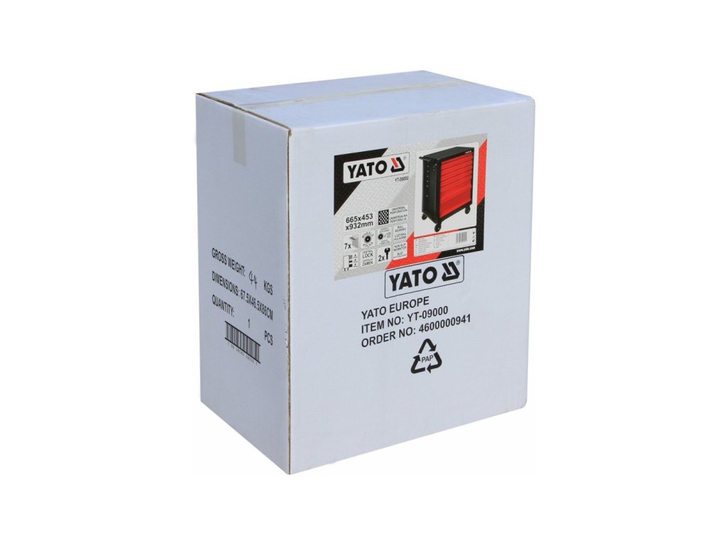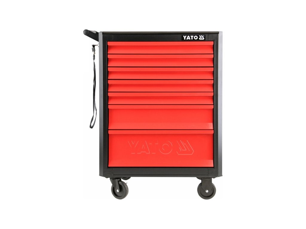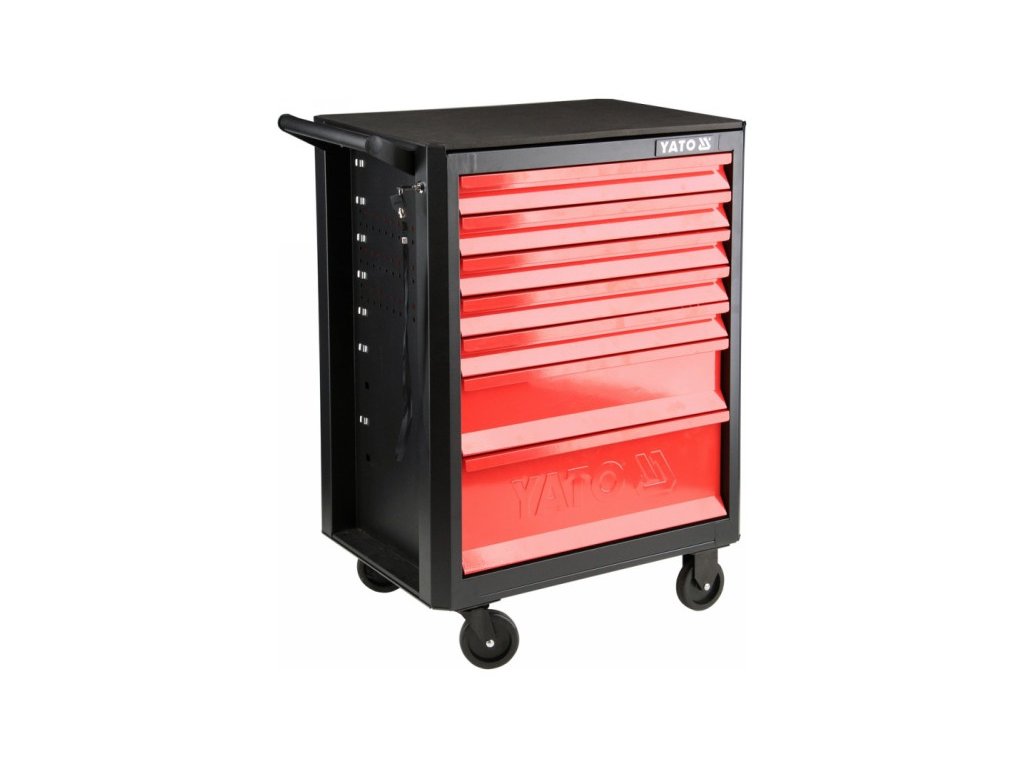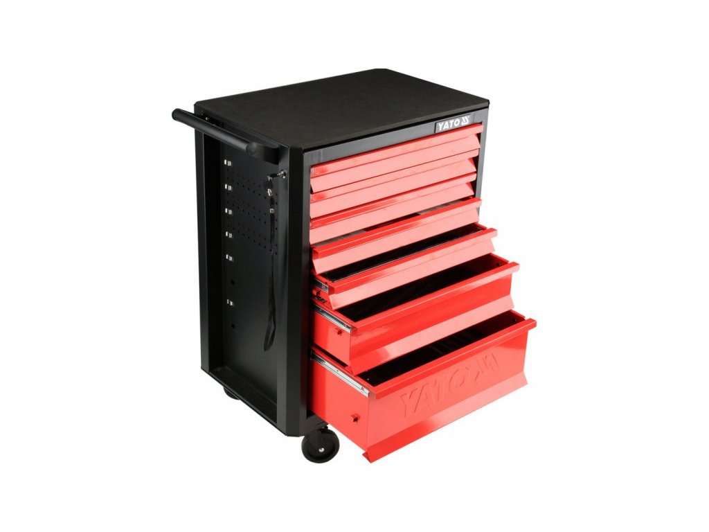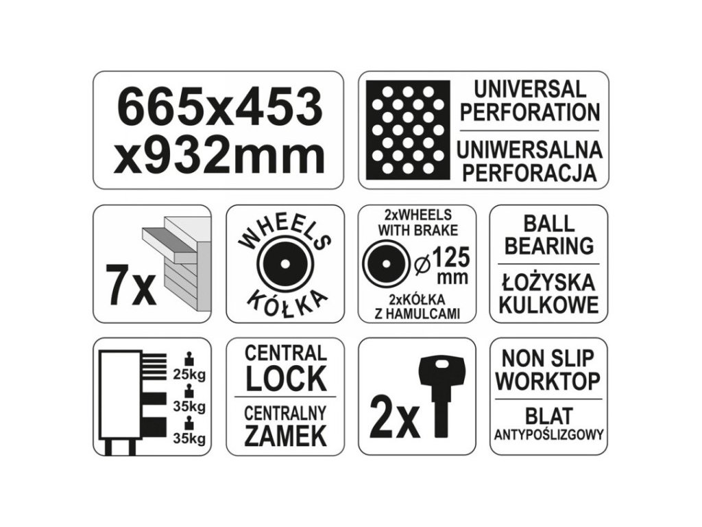 Professzionális műhelyszekrény 7 fiókkal: 5 keskeny, egy közepes és egy nagy méretű. Minden fiók központi zárral van ellátva a biztonság érdekében. A szekrény forgó kerekekkel rendelkezik fékkel, ami megkönnyíti a mozgatást. A munkalap masszív fémből készült, csúszásmentes szivaccsal borítva – a munkalap maximális terhelhetősége 210 kg. Az oldalsó perforáció lehetővé teszi az oldalfelületek kihasználását. A szekrény méretei: 665 x 453 x 932 mm.