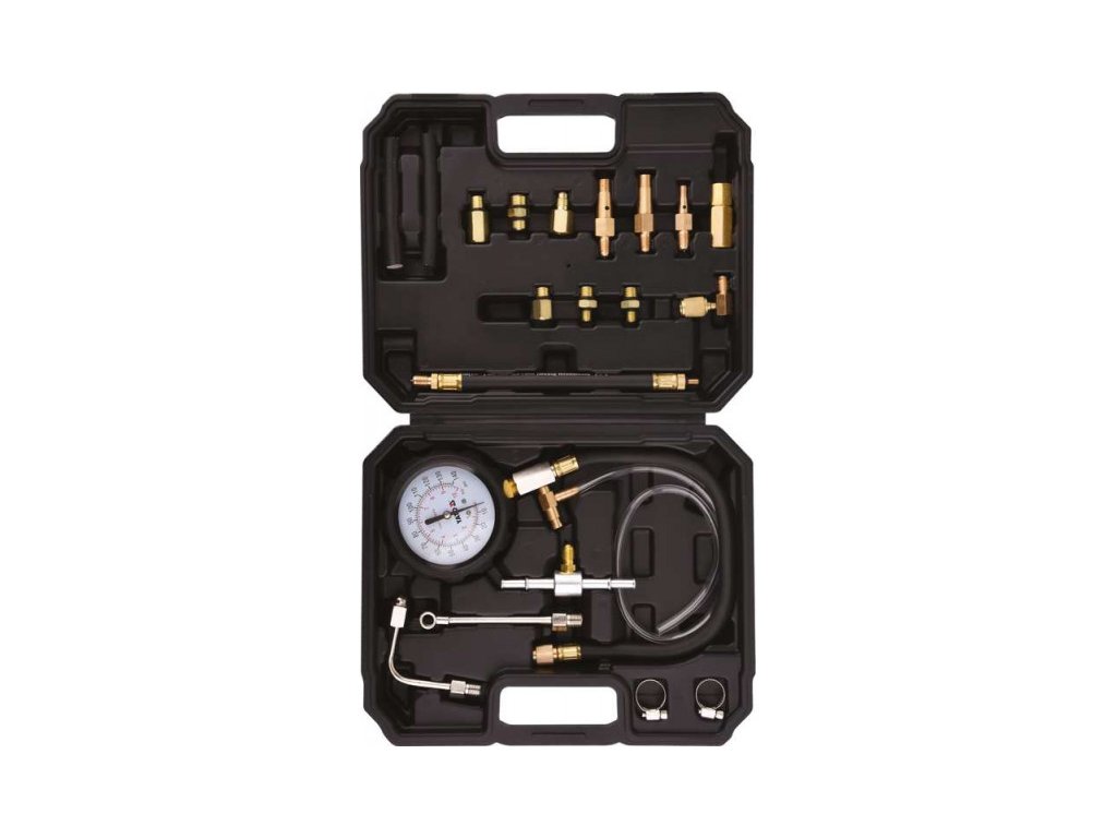 Sada na meranie tlaku paliva pre naftové a benzínové motory, s dvojitým displejom stupnice, flexibilná hadica s odvzdušňovacím ventilom, koncovkami a redukciami Technické údaje: Dĺžka hadice: 370 mm Priemer meradla: 100 mm Rozsah merania: 0-1 / 0-140 MPa. / PSI