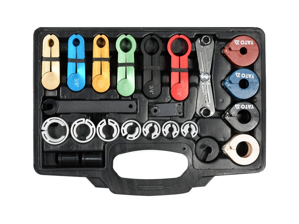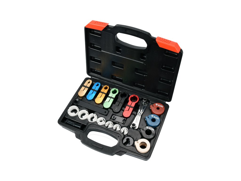 Professzionális készlet üzemanyagrendszerek és légkondicionálók csatlakozóinak kioldásához, nyitásához. A csipeszek a csöveket összeszorítják és tartósan blokkolják a szivárgásokat. A csipeszek kiválóan alkalmasak különféle gumi és műanyag csövekhez. A csipeszek a legtöbb autómárkához illenek, lehetővé téve például a freon gyors blokkolását a légkondicionáló csövekben. Univerzális készlet, hasznos bármely üzemben és műhelyben.