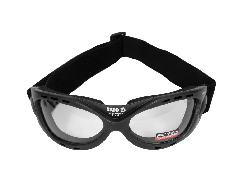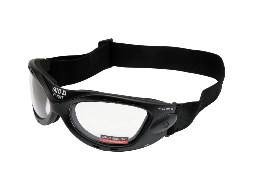 Védőszemüveg YT-7377, szemüveghez hasonló keretkialakítással, tökéletesen illeszkedik az arcra. A szemüveg nem csak az elől felől, hanem szinte minden irányból védi a szemet, ezért ajánlott poros körülmények között dolgozni (pl. gittel kézi csiszolás) és olyan helyzetekben, ahol nem tudjuk előrejelezni a munkadarab irányát (pl. fűrészelt fa vágása vagy róka farok eszközzel).Optikai osztály: 1 - legmagasabb minőségű látómező, folyamatos munkavégzésre ajánlott lencse anyaga: polikarbonát keret anyaga: nylon + állítható rugalmas szíj habos gumi alapú szemüveg belül, a tökéletes illeszkedés érdekében az arcra az üveg ovális kialakítása széles látószöget biztosít a szellőzőnyílások csökkentik a szemüveg belső párolgását A szemüveg F szintű mechanikai szilárdsággal rendelkezik, vagyis képes ellenállni egy 6mm átmérőjű, 0,86g súlyú és 45m/s sebességű acélrészlet ütésének. Megfelel az EN166 szabványnak.