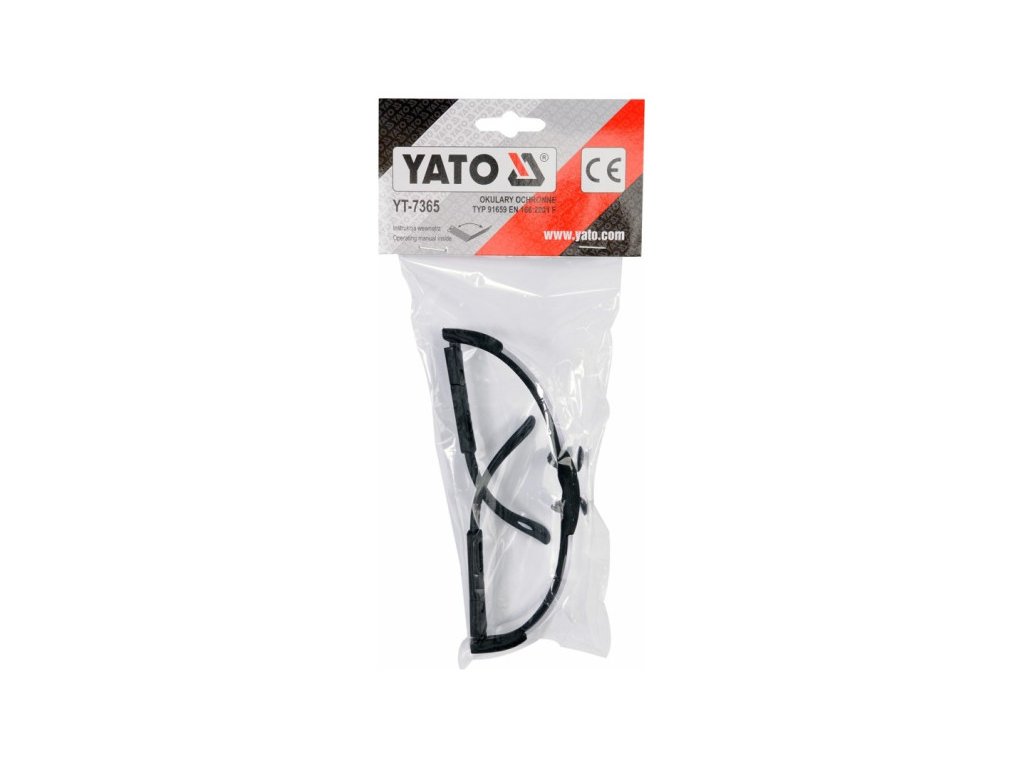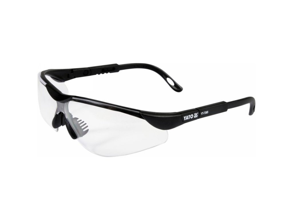 Védőszemüveg YT-7365, melyet kézi és gépi munkákhoz, például csiszoláshoz, fúráshoz, véséshez stb. terveztek.