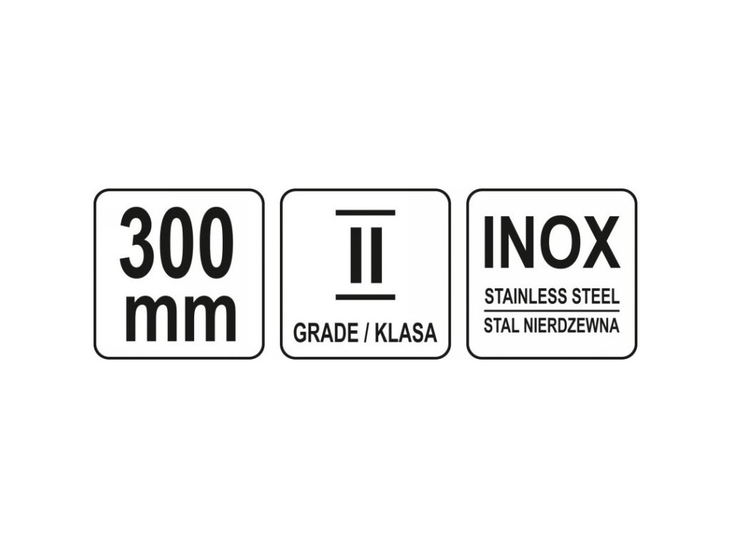 Hajlékony vonalzó II. osztályú pontossággal. Rozsdamentes acélból készült. Mindkét oldalán állandóan alkalmazott milliméteres skála. Szélessége 25 mm, teljes hossza 334 mm, vastagsága 1,1 mm, a hátlapján menetértékek átváltó táblázatai. Pontos mérésekhez és jelöléshez lakatosmunkában, mechanikában, dekorációban stb.